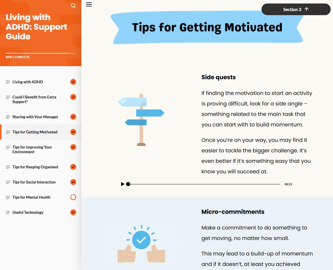 This informed specific design choices: optional audio on every page, colour-coded sections, short text chunks with clear line spacing, careful pacing and a conversational tone. I designed everything in short bursts—no longer than 5 minutes—making content easier to absorb for neurodivergent learners and reducing the barrier to engagement as the learning wasn't mandatory. I also created a version of the dyslexia support guide using OpenDyslexic font.